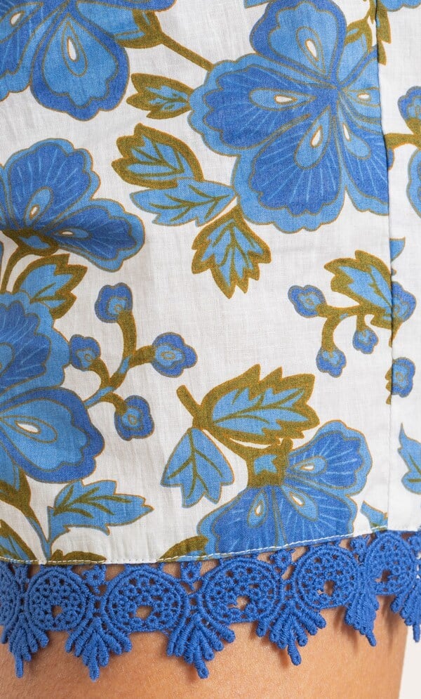 Cool cotton shorts decorated all over with a floral print, wear yours with our matching top style 310BQS1 for a put together look or a plain top and let the shorts take centre stage. Our shorts come with an elasticated waist and have been finished with intricate lace trim to the hemline. Inside leg 9cms.