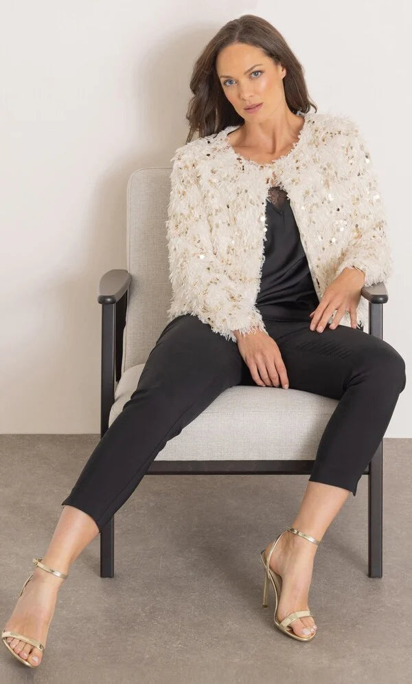 The perfect way to finish off your going out outfit is with this tactile cream eyelash knit and gold coloured sequinned cover up. Fully lined with full length sleeves and button fastening to the round neckline. Back length 55cms.