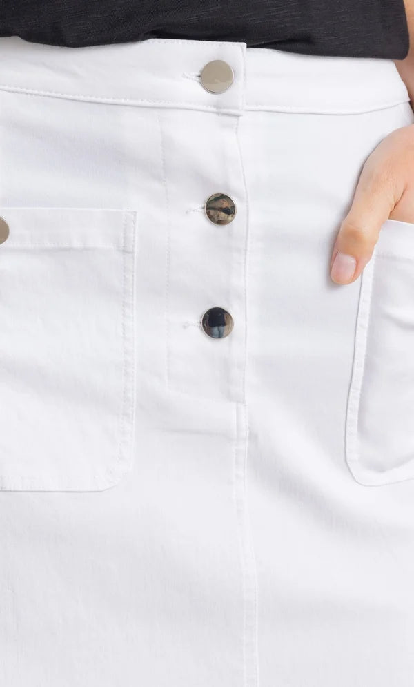 You will love our lightweight stretch skirt that falls at the knee, has silver coloured button fastenings to the front, mock back pockets and button decorated functional front pockets. Perfect teamed with your favourite tops for daytime dressing. Back length 61cms.