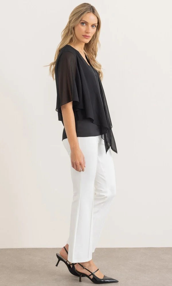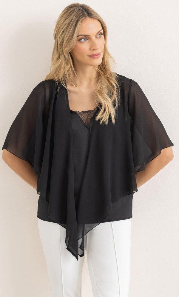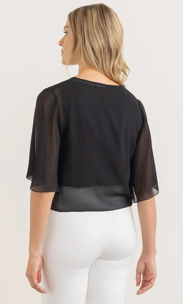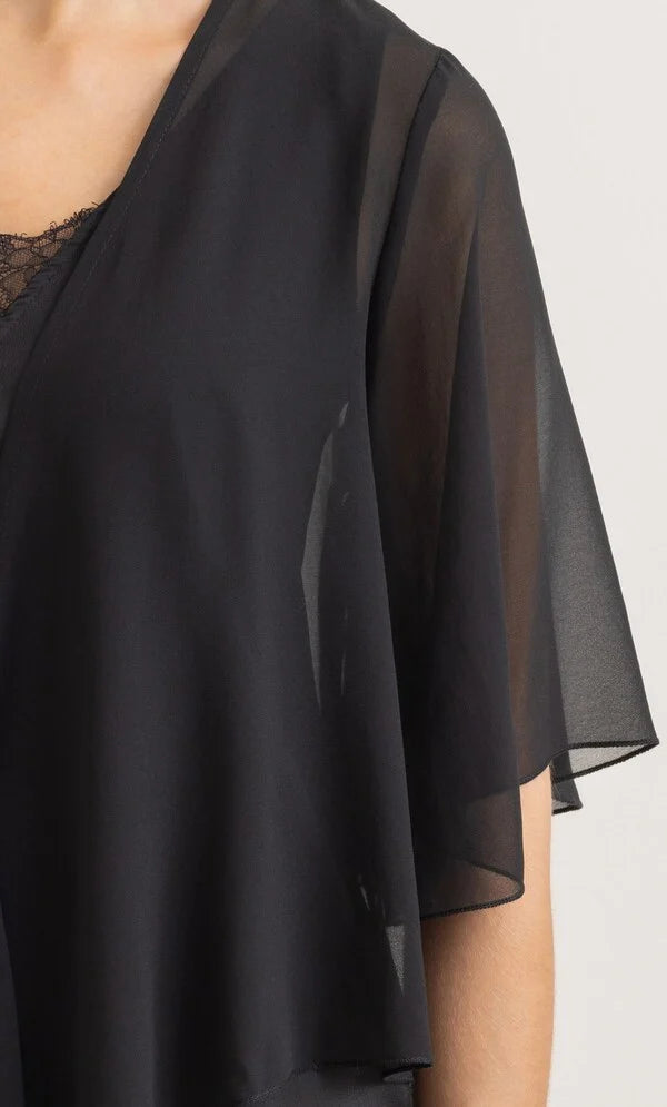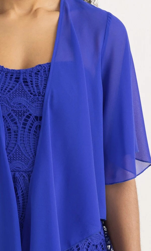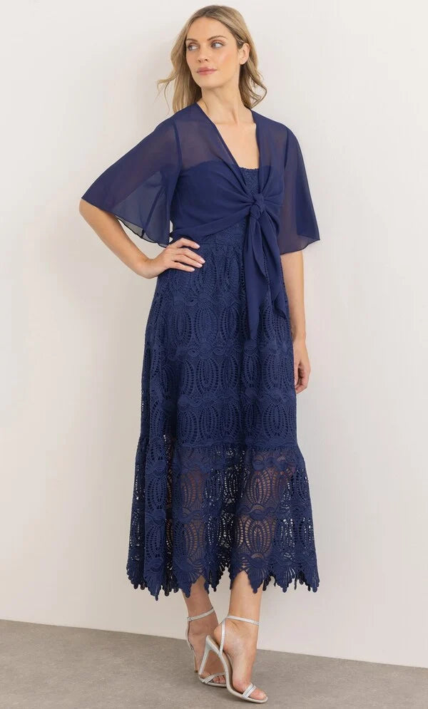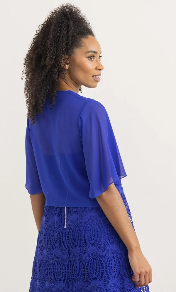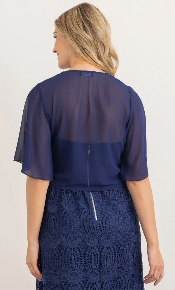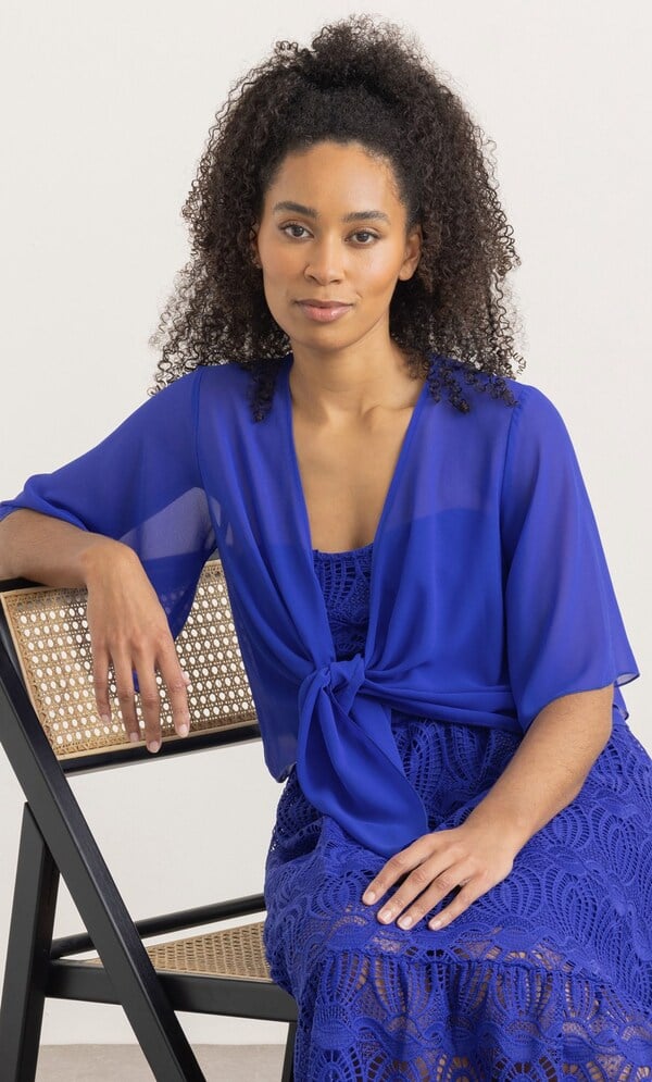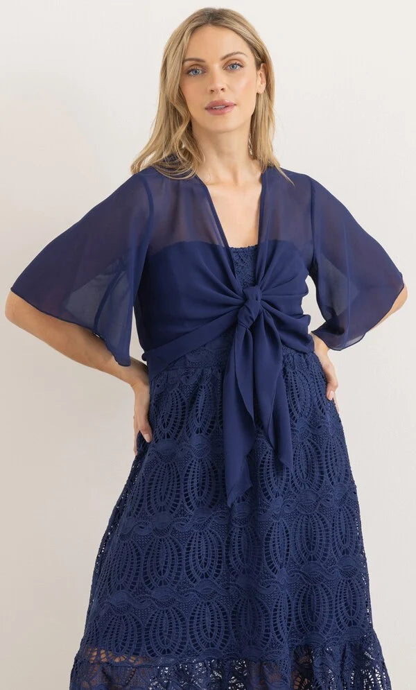 Complete your look with our floaty midnight chiffon cover up that will add elegance to your occasion outfit, designed with short sleeves and self tie to the front. Wear yours over your favourite dress or pair with smart bottoms and a cami top. Back length 50cms.